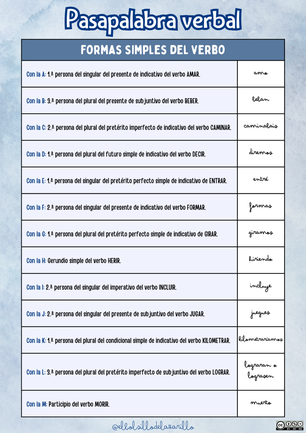 ¡Hola, lazarillos y lazarillas! Hace unas semanas jugamos al Pasapalabra verbal en Ámbito Sociolingüístico en 1.º ESO y compartí en mis historias de Instagram una foto de la pizarra, donde escribí las formas verbales que propuse para el rosco, y una foto de la plantilla de Pasapalabra de @losrecursosdeunaptal que usé para esta actividad.